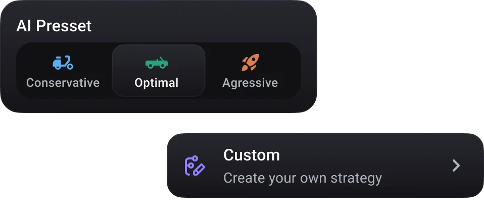 You can start at any experience level. Use AI Presets to launch an AI trading bot in just a few taps, or practice on a demo account with a virtual balance. You can switch between automated and manual setups at any time.