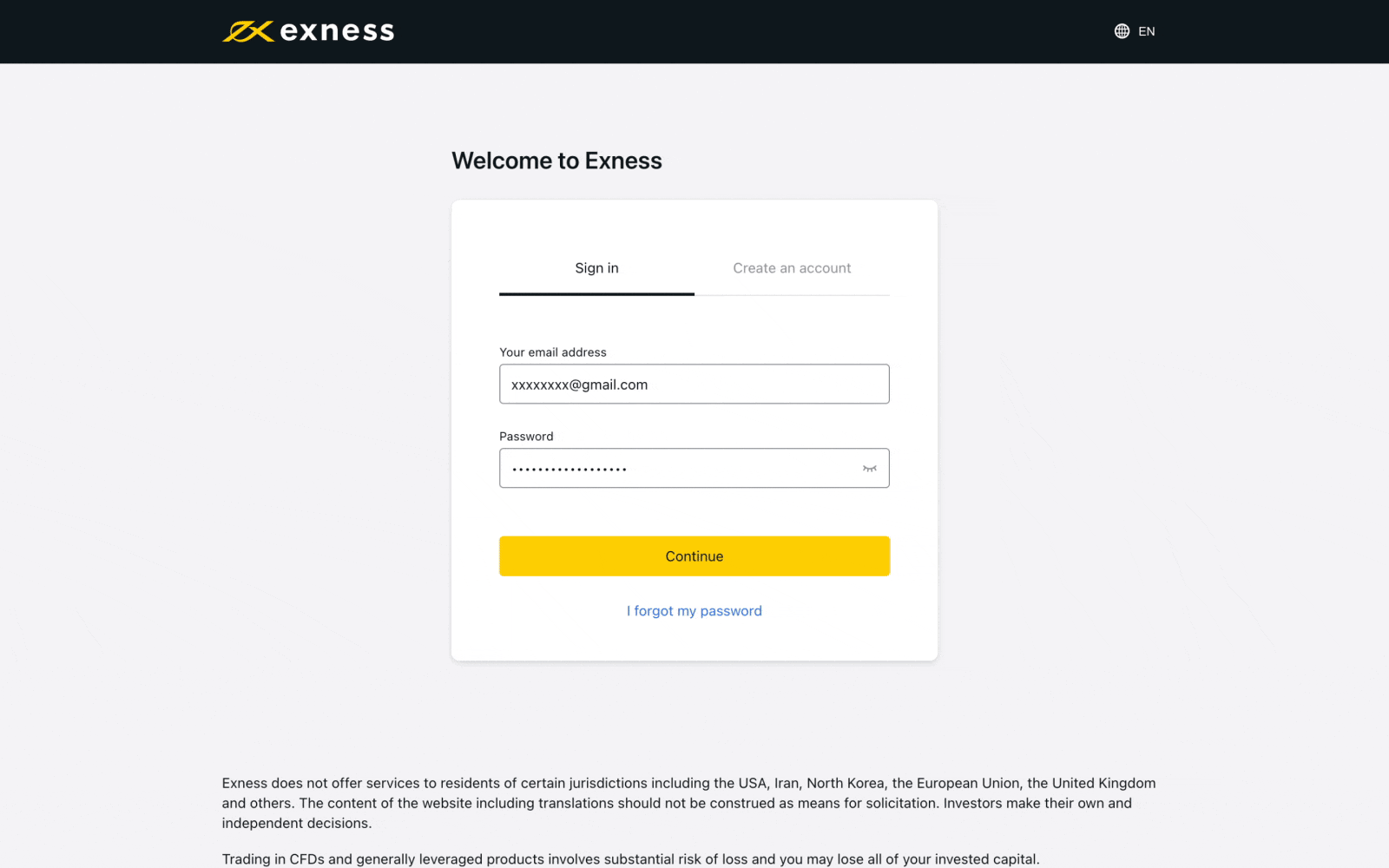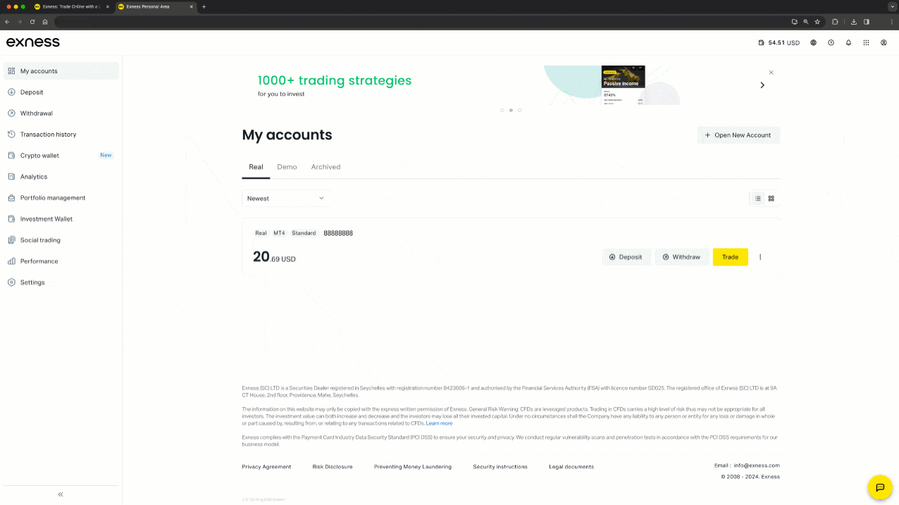 Once you’re on your broker’s webpage, you can proceed with the withdrawal. We’ll show you how to do this using Exness as an example. To withdraw on Exness, first log in to your Personal Area, then follow these steps: