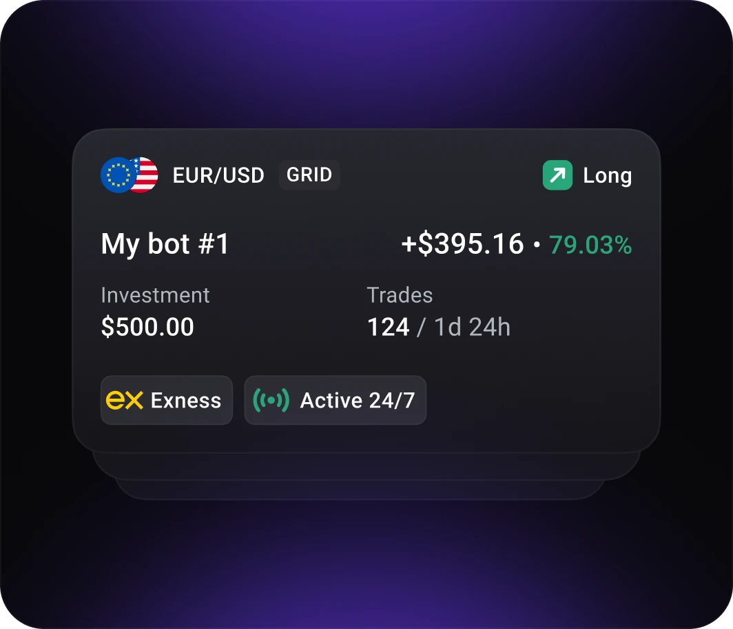Build and run automated forex strategies on Exness without writing code. Define your trading logic, set rules and inputs, and launch through a clear, guided setup.
